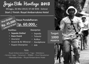 Jogja Bike Heritage 2013, Royal Ambarrukmo Hotel, Tugu, Malioboro, Keraton Jogja, Tamansari, Wijilan, Pura Pakualaman, Mandala Krida, dan kembali ke Royal Ambarrukmo Hotel.